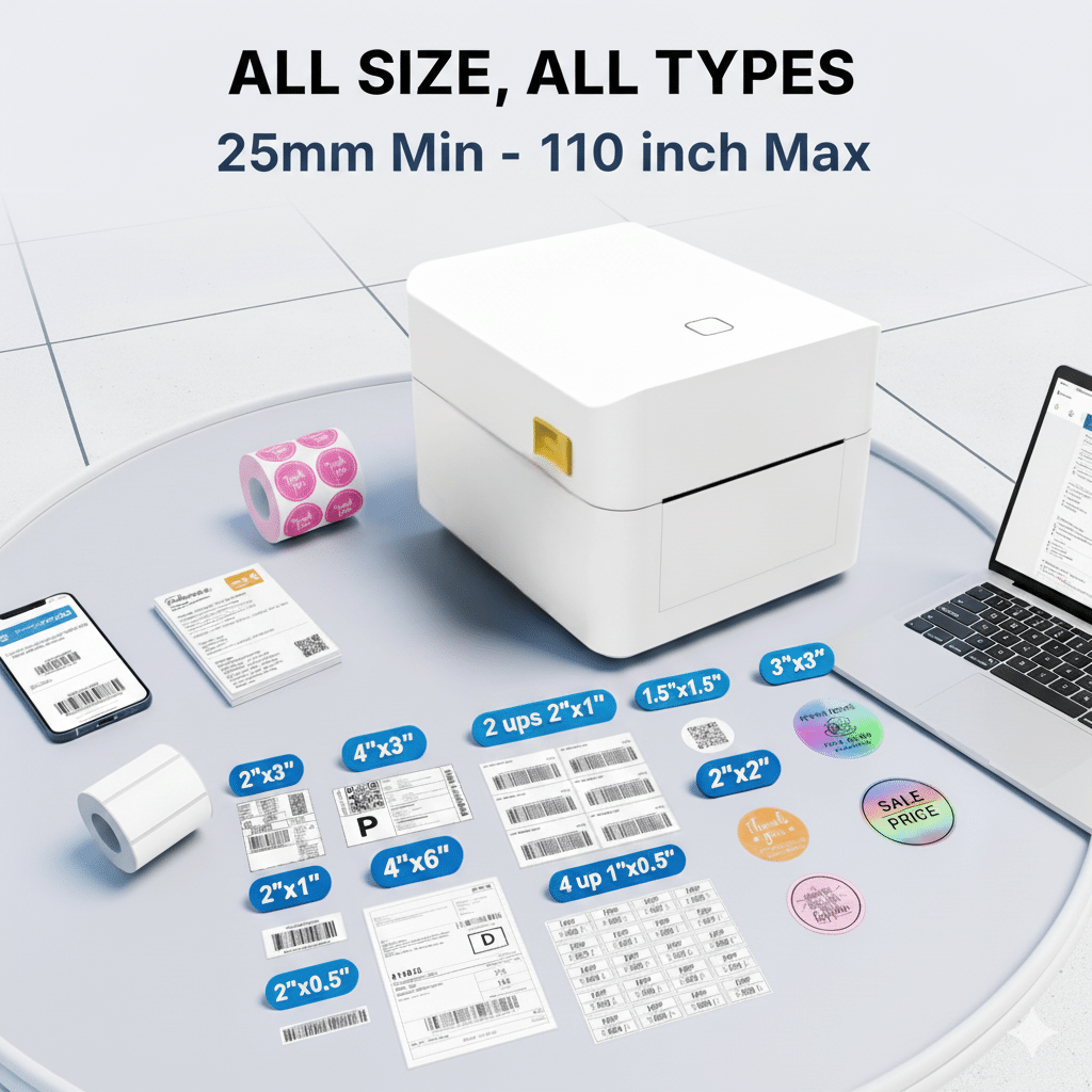 - 𝗙𝗹𝗲𝘅𝗶𝗯𝗹𝗲 𝗟𝗮𝗯𝗲𝗹 𝗦𝗶𝘇𝗲𝘀: Supports a wide range of label sizes from 1 inch to 4.25 inches in width and 0.4 inch to 6 inches in length. Whether you need 4×6 courier labels, product labels, price tags, or barcodes, this printer adjusts easily to meet your business needs. Works with standard as well as transparent and colored thermal labels.